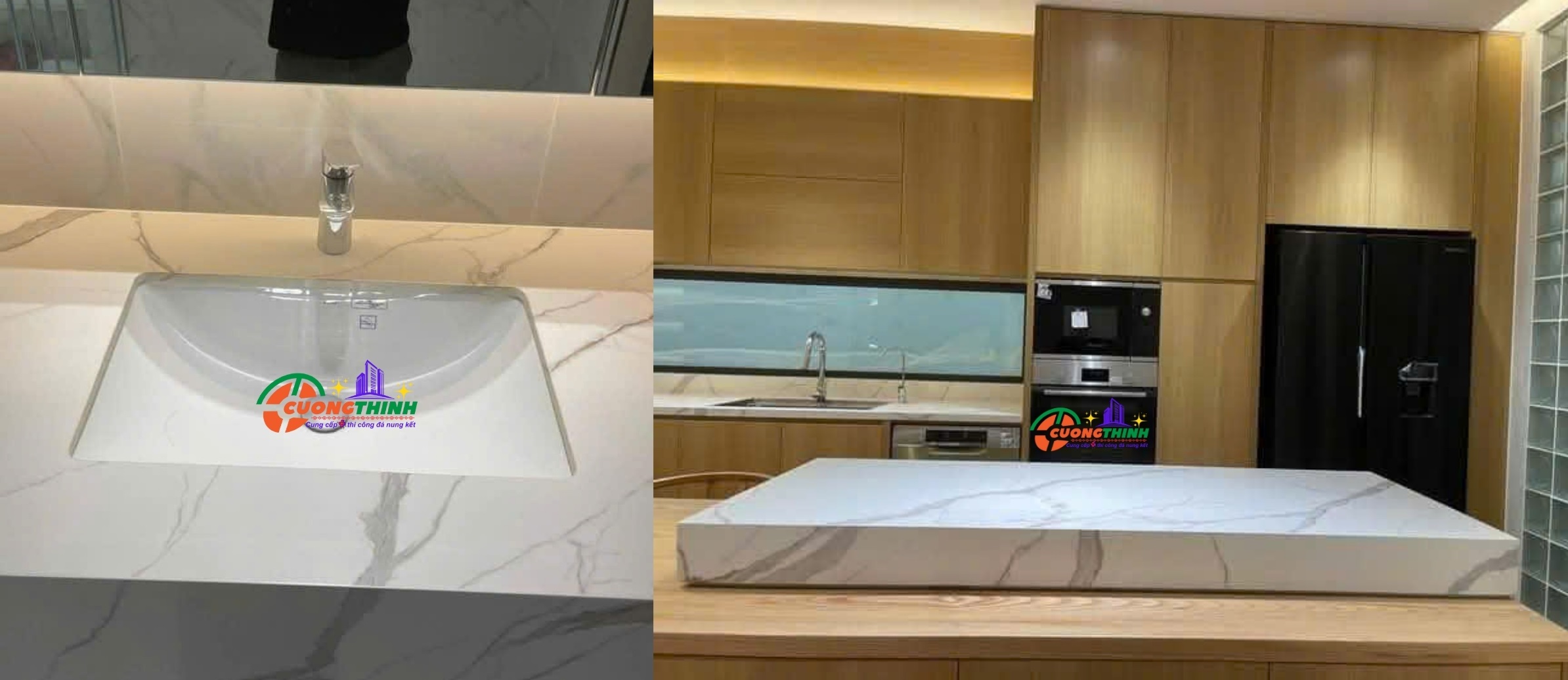 - Bàn bếp và bàn ăn: Độ bền cao, dễ vệ sinh, mang đến sự sang trọng và tiện ích.