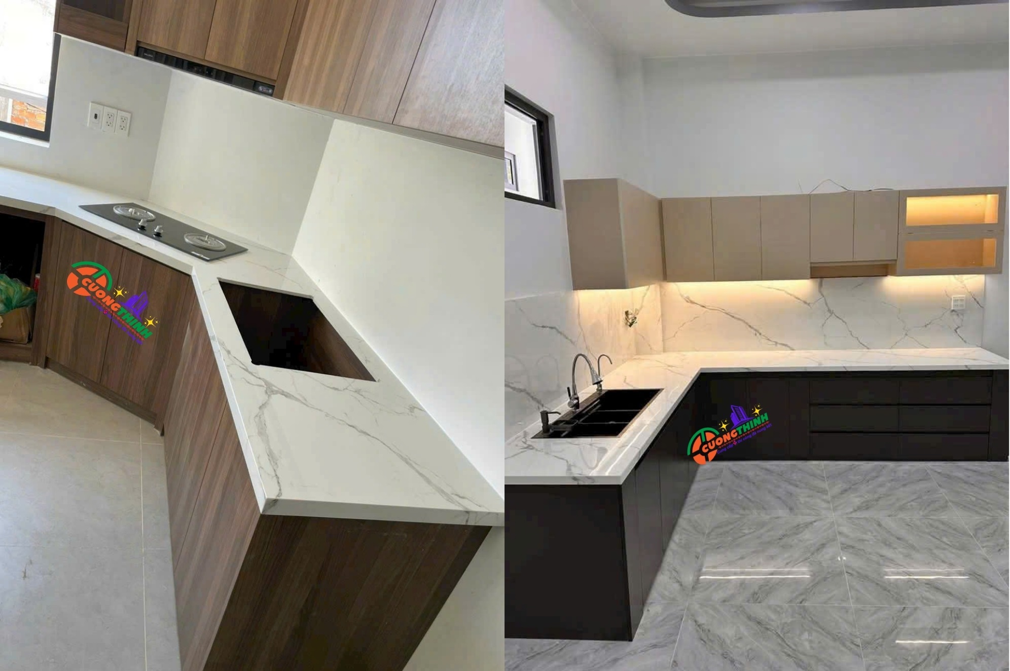 - Bàn bếp và bàn ăn: Độ bền cao, dễ vệ sinh, mang đến sự sang trọng và tiện ích.