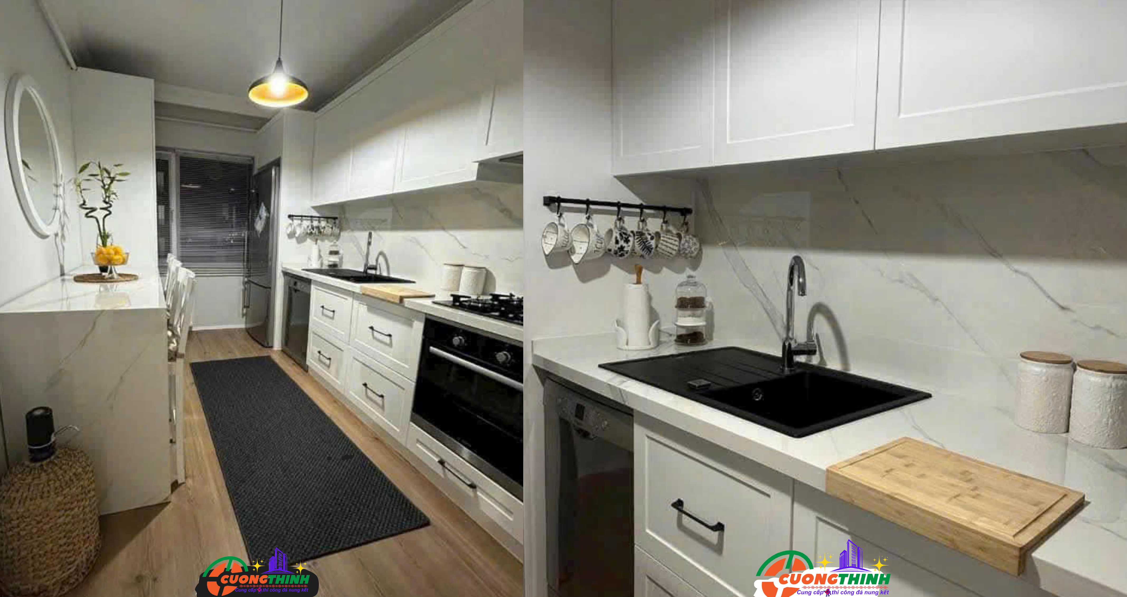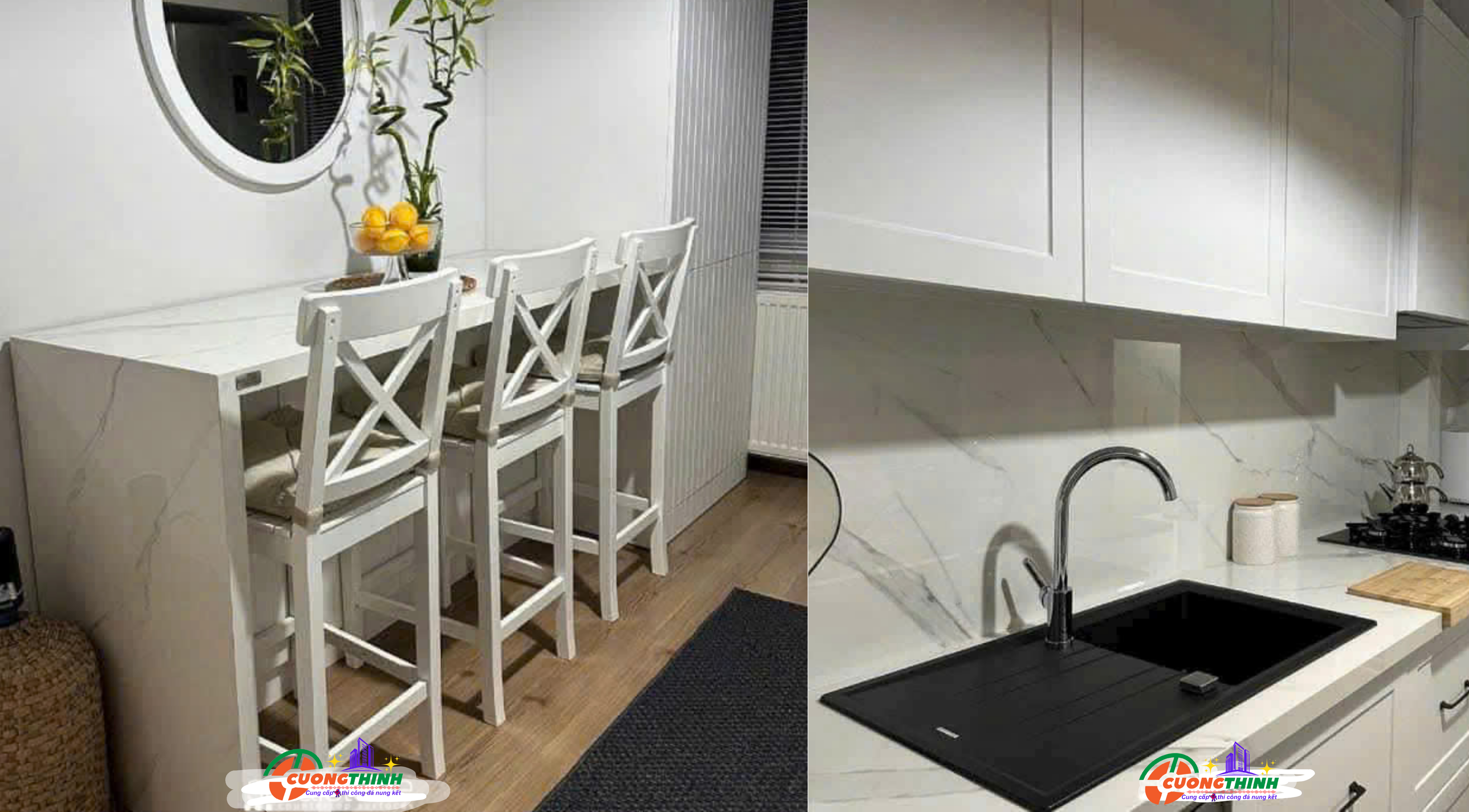 - Bàn bếp và bàn ăn: Độ bền cao, dễ vệ sinh, mang đến sự sang trọng và tiện ích.