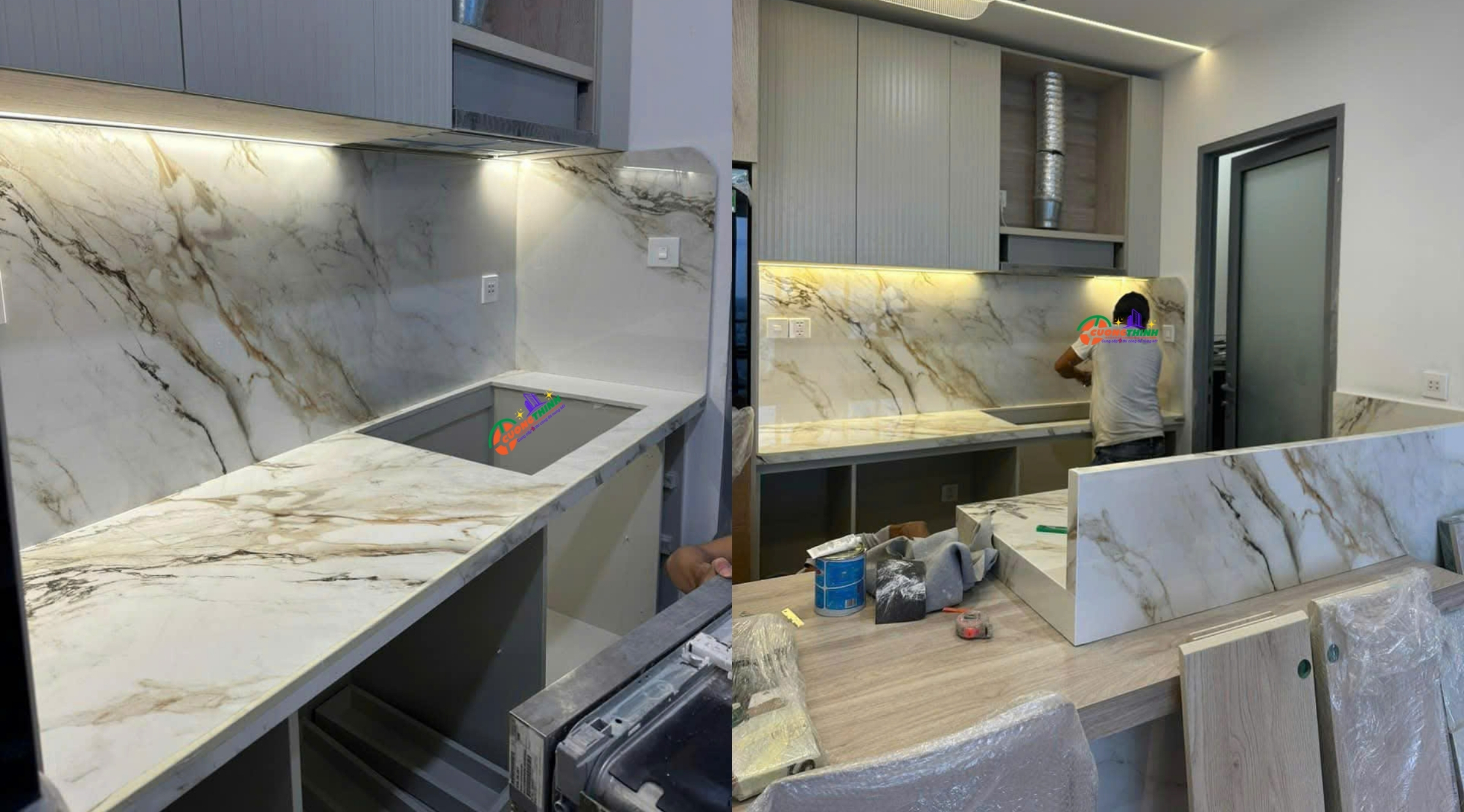 - Bàn bếp và bàn ăn: Độ bền cao, dễ vệ sinh, mang đến sự sang trọng và tiện ích.